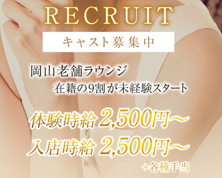 岡山の老舗 ラウンジ ハーラン! 求人強化月間スタート! 岡山・中央町で多くのファンから人気を誇る老舗ラウンジハーラン! おもてなしと上品さを大切にするお店でワンランク上のお客様が中心です。 岡山中央町で水商売の激戦区で長年に渡り圧倒的な集客力を誇るお店です。 「メインフロア」「VIPフロア」の空間が用意されています 「会員制」にこだわったお店作りにより上質なお客様のみになっている所も特長の一つです。 そんな紳士的なお客様ばかりですので、とても接客しやすい為 働くキャストは20代~40代迄幅広く経験者・未経験者の方も楽しく働けると思います。 閉店時間には必ず閉めダラダラ営業は致しませんのでWワークの方もオススメです。 キャストやスタッフからもとても慕われているオーナーママとスタッフのみんなで仕事に慣れるまで完全サポートします!